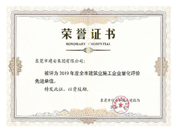 過(guò)去二十年,東莞建安集團(tuán)獲得國(guó)家級(jí)綠色建筑示范工程、省級(jí)市級(jí)安全文明示范工地及工程優(yōu)質(zhì)獎(jiǎng)、詹天佑故鄉(xiāng)杯等獎(jiǎng)項(xiàng)超過(guò)100個(gè);獲得了國(guó)家商務(wù)部的“企業(yè)信用評(píng)價(jià)AAA企業(yè)”稱號(hào)、國(guó)家統(tǒng)計(jì)局的“中國(guó)建筑業(yè)500強(qiáng)”稱號(hào)、廣東省“連續(xù)十七年守合同重信用企業(yè)”稱號(hào);并成功申創(chuàng)省級(jí)工法等,贏得了良好的市場(chǎng)口碑。