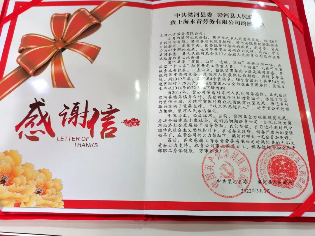 最后,再次感謝上海永青勞務(wù)服務(wù)有限公司對(duì)梁河縣的無盡關(guān)愛和大力支持。祝貴公司事業(yè)蒸蒸日上,祝各位領(lǐng)導(dǎo)和全體干部職工身體健康,萬事如意!